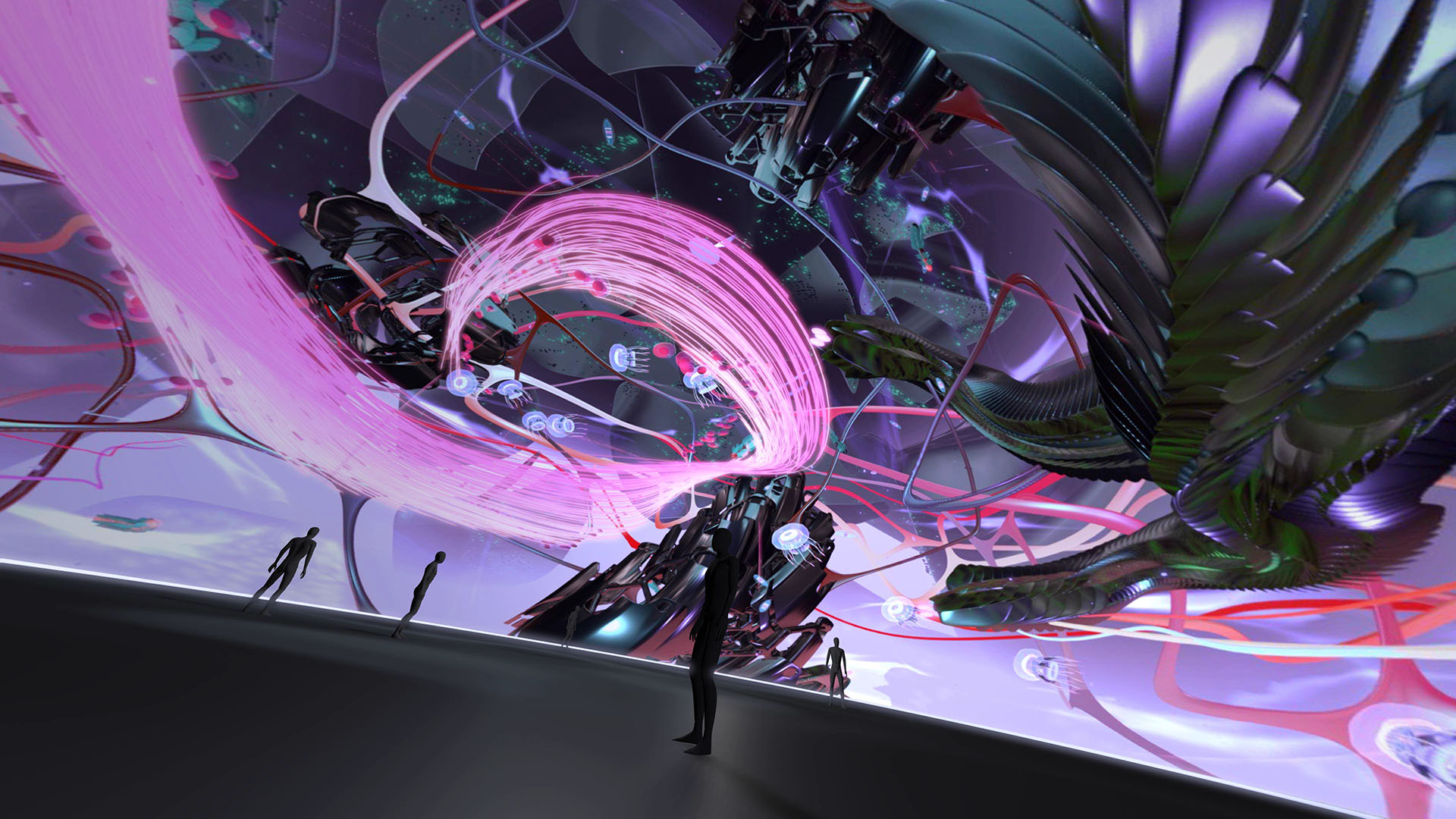 Im Fulldomevideo „Mirrored Madness“ entfaltet ein Ökosystem aus Cyberorganismen seine Formen,
